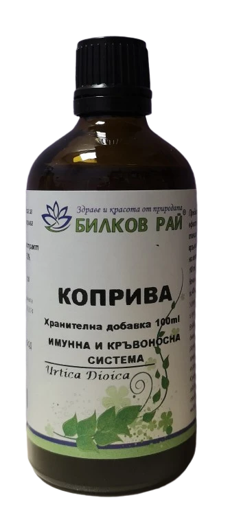 КОПРИВА ТИНКТУРА 100 мл. БИЛКОВ РАЙ Оказва благоприятен ефект върху имунната система, тонизира организма, балансира кръвната захар, естествен источник на желязо.