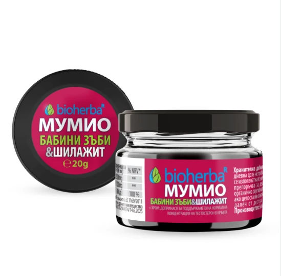 Мумио с Бабини зъби и Хром, на Биохерба, е висококачествена хранителна добавка, съчетаваща силата на природата с модерната наука. Продуктът комбинира три мощни съставки – мумийо (Shilajit), екстракт от бабини зъби (Tribulus terrestris) и хром пиколинат – за цялостна подкрепа на организма, с акцент върху енергията, либидото, метаболизма и хормоналното равновесие.
